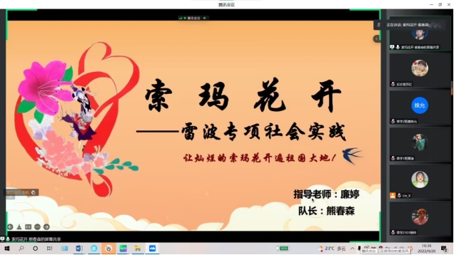 为进一步总结2022年暑期“三下乡”社会实践工作,引导青年学生积极参与建设美丽中国的生动实践,以优异成绩喜迎党的二十大,9月20日,91论坛团委以线上形式举办了2022年暑期社会实践分享会。四支优秀团队结合各自实践开展情况,为20、21、22级140余名同学进行经验分享。团委廉婷老师作指导分享。