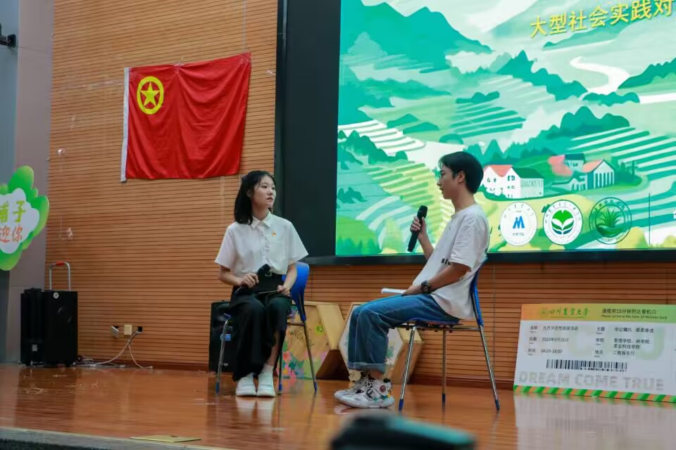 第三届“实践归来话成长”圆桌会议上,对十佳团队“携农险·系三农”负责人邓清圳进行现场访谈。同学们聆听他们的实践经历、心得感悟,感受其以实践出真知,以实践促成长。