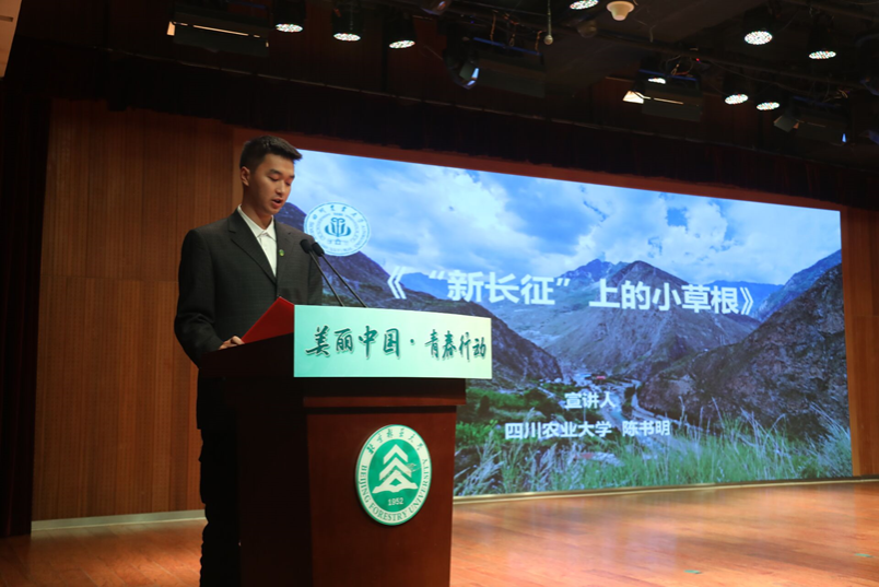 “川西北草根”研究生绿色长征科考实践团队成员陈书明作为受邀团队代表在大会上作题为《“新长征”上的小草根》主题宣讲。该团队在2022年全国绿色长征科考实践过程中,以“生物多样性保护”为主题,以专项课题+实践研究、社会支持+成果转化的实践思路,以“博士指导、硕士主导、本科协助”的组建思路,充分发扬“川农大精神”,用脚步丈量祖国大地,从海拔1500米到4000米,翻越无数高山,克服高温酷暑、蚊虫叮咬等重重困难。曾在荒无人烟的深山过夜,曾钻进2米深的杂草丛,曾用铁铲一步一个坑登上一毛不拔的陡坡……在高原扎根数月,踏足全省2州6县100余乡镇,累计行程超5万公里,协助完成草地数据面积约347.3万亩,有毒有害生物普查踏查路线329.5公里,样地基本信息踏查路线313.4公里,高效推动全省林业和草原局全面开展草原有害生物普查和草原基况监测工作。