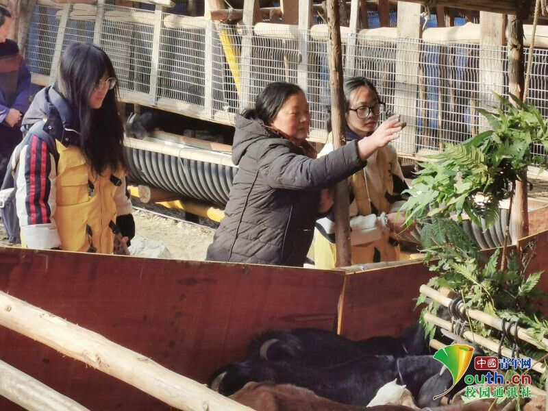 禹里镇的村民淳朴热情,在村干部的带领下,实践队员们很快便到了一位农户家中。正值清晨,农户家中的牛羊还未被放出,队员们便趁此近距离感受了和牛羊的接触。性格温顺的小羊和肥硕的肉牛都来自农户数月的精心饲养,据团队成员曹丁予称:“牛的块头真的很大,羊的数量也很多,看到这些的第一眼我就觉得饲养一定是一个很具有挑战性的问题。”因此实践队员们就饲养问题与农户们展开了交流,这家农户主告诉队员们,饲料的主要成分是玉米粉、豆渣、酒糟和大麦草。为了进一步了解饲料的制作和原料的培育,队员们和农户主一起来到了屋后方的田地。冬季的大麦草长势依旧良好,但根据现有的资料显示,大麦草作为一年生草本植物,必须一年播种一次,这与那些多年生草本植物收割后可以继续生长相比,无疑是一个巨大的工程量,对农户们来说也是个非常艰辛的任务。