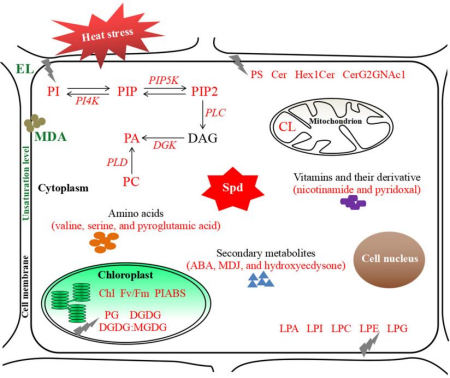 图2亚精胺(Spd)调节代谢稳态、膜脂重塑和脂质信号提高植物耐热性