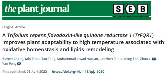 近日,91论坛彭燕/李州团队在国际著名期刊《The Plant Journal》上发表题为“A Trifolium repensflavodoxin-like quinone reductase 1 (TrFQR1) improves plant adaptability to high temperature associated with oxidative homeostasis and lipids remodeling”的研究论文,揭示了TrFQR1通过调节线粒体电子传递、活性氧稳态和脂质重塑提高冷季型草类植物白三叶(Trifolium repens)耐热性的新机制。
