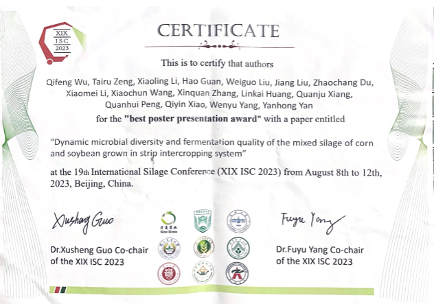 此次会议期间展示了来自不同国家地区150余份学术墙报,颁发了第十九届国际青贮饲料大会优秀墙报奖,我院博士研究生武齐丰等同学完成的《Dynamic microbial diversity and fermentation quality of the mixed silage of corn and soybean grown in strip intercropping system》(玉米大豆带状复合种植混合青贮饲料动态微生物多样性及发酵品质分析)荣获“优秀墙报奖”。