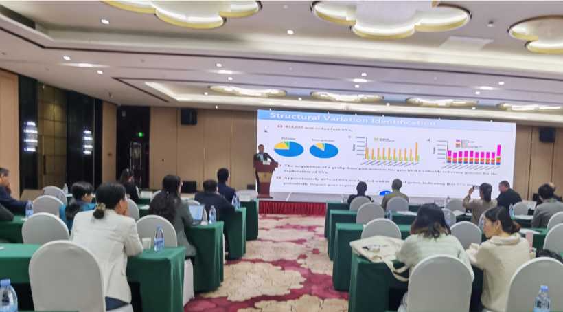 黄琳凯教授作了题为“Pangenomic analysis identifies structuralvariation associated with heat tolerance inpearl millet”大会英文报告,介绍了团队在美洲狼尾草泛基因组构建及耐热机制解析方面取得的重要进展。