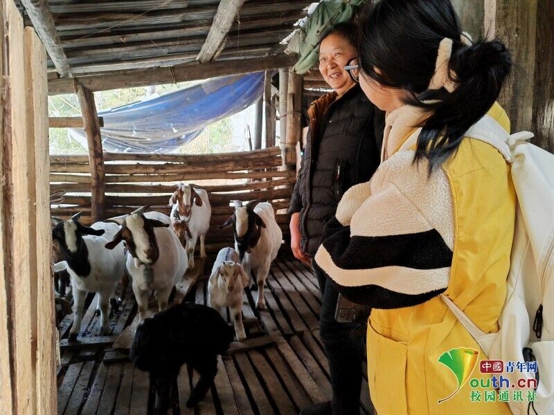 实践队员们看到了农户家饲养的山羊,他们还注意到当地由于地势原因,羊棚大多为悬空的木架结构。当他们与农户谈到饲养的山羊时,农户脸上便洋溢起笑容。