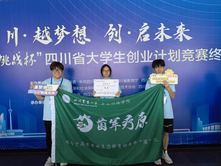 由周冀琼等老师指导、卢兆胤等同学参与的项目《菌军疗原——西部高寒退化草地修复的先锋菌队》斩获银奖。该项目聚焦由于气候变化和人类活动对我国以青藏高原为首的西部高寒草地的影响,团队历时七年系统收集了青藏高原东缘天然高寒草地根际土壤中的有益微生物,经选择培养及分离纯化构建菌种资源库,并研发出了多款具有针对性地用于高寒草地修复的微生物菌剂产品,有效治理了草原生态。