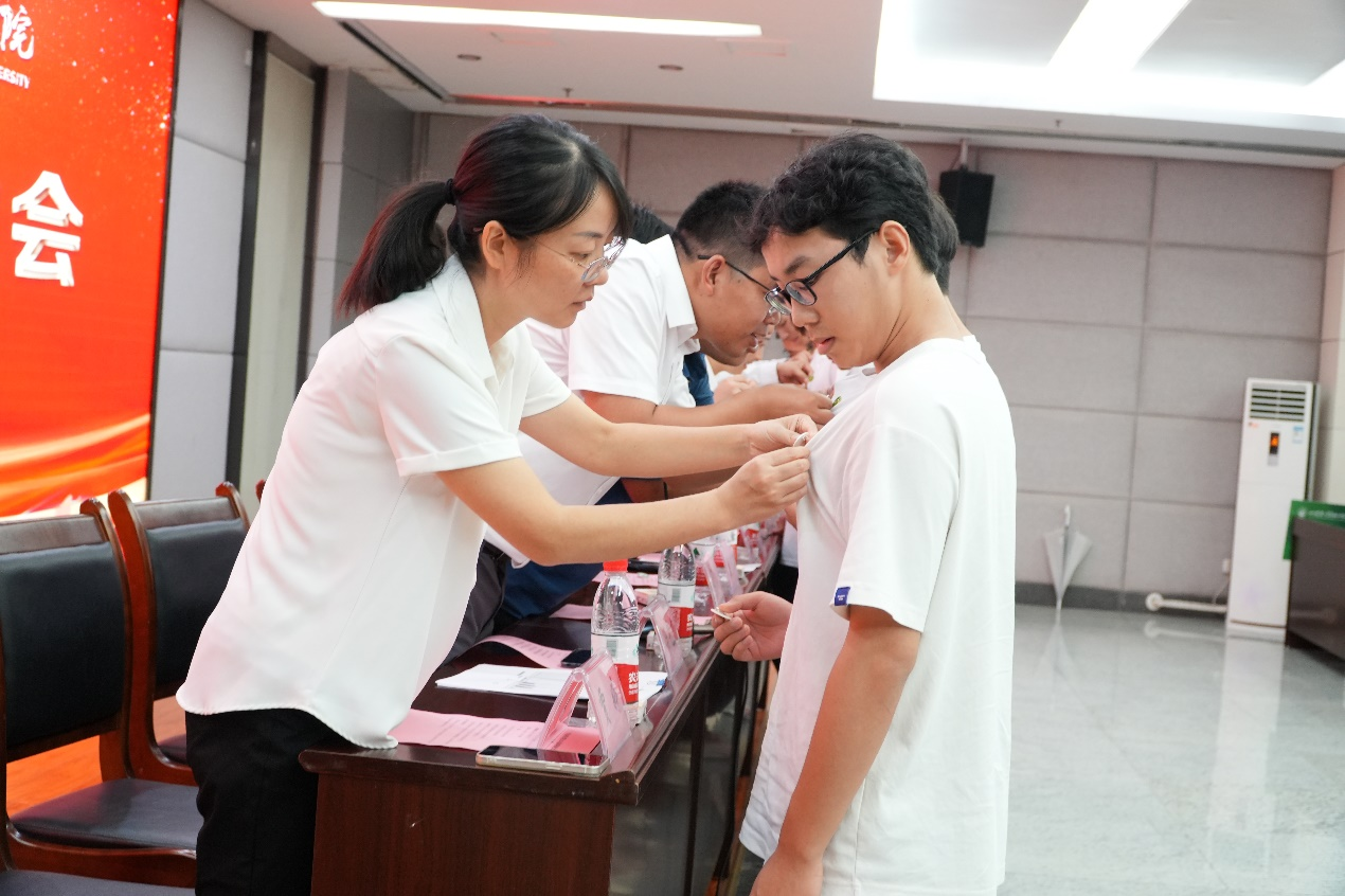 主席台就坐的领导和老师为新生代表佩戴院徽,其余新生全体起立自行佩戴。在这庄重且温馨的时刻,每一枚院徽都蕴含着91论坛的文化与历史,鼓舞着全体新生奋勇向前。