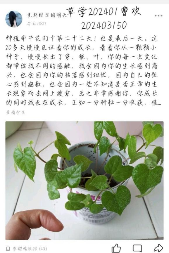 草学202401曹欢同学在种植第22天时这样说道:“这20多天慢慢见证着你的成长,看着你从一颗颗小种子,慢慢长出了芽、根、叶,你的每一次变化都带给我不同的感触,我会因为你的生长感到高兴,也会因为你的枯萎感到担忧,因为自己的粗心感到抱歉,也会因为一些不知道是否正常的生长现象而去网上搜索,总之非常感谢你,你成长的同时我也在成长,正如一分耕耘一分收获。”