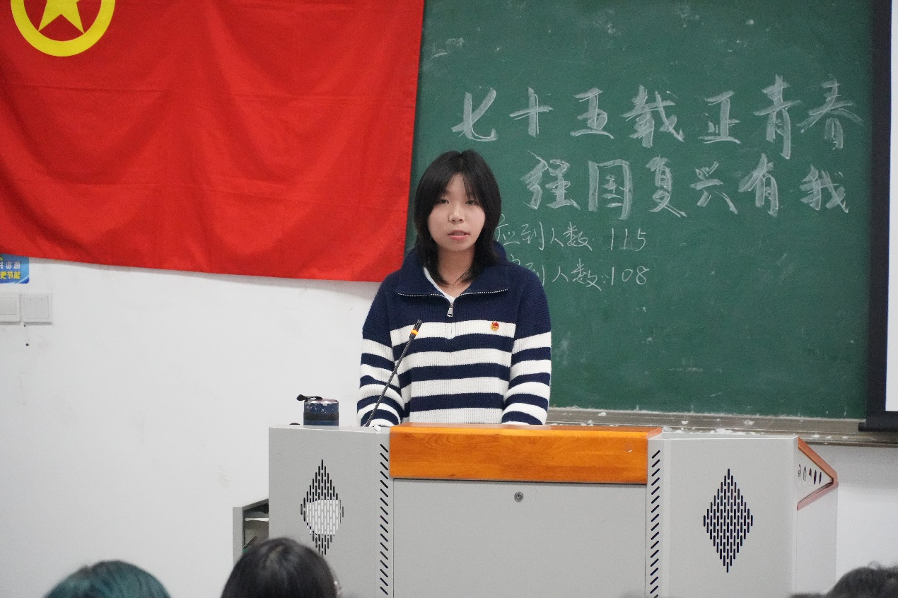 学校第十一期青马班学员、草坪202201丁佳渝从光辉进程、历史启迪以及青年奋斗三个方面向同学们分享了“革命理想高于天,事业靠本领成就,把小我融入大我”的历史感悟,让爱国主义旗帜在青年心中飘扬,激励团员青年们在中国式现代化建设的道路上挺膺担当、奋楫远航。