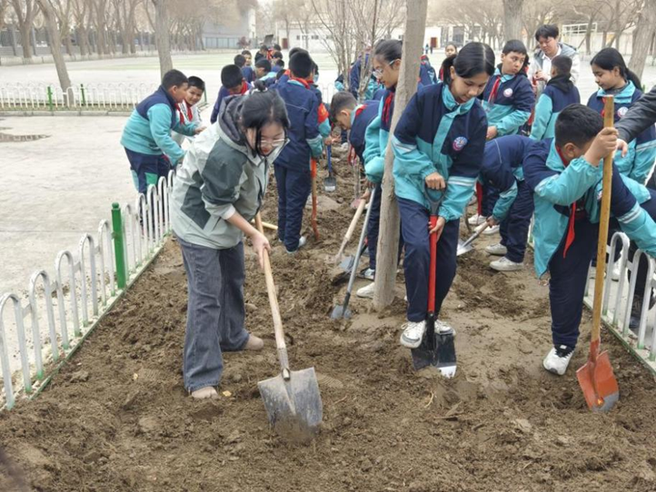 课后,墨玉县第四小学的生态教育从云端延伸至土地。在当地老师的指导下,孩子们亲身参与到植树活动中,挖坑、栽树、填土、浇水,每一株新栽的树苗上还挂着大家精心制作的心愿牌,上面写满了对绿植茁壮成长的美好期许和对生态保护的坚定誓言。这场融合劳动实践与生命教育的植树行动,是对“美丽中国”的生动演绎,也构筑起边疆校园“知行合一”的生态教育新范式。