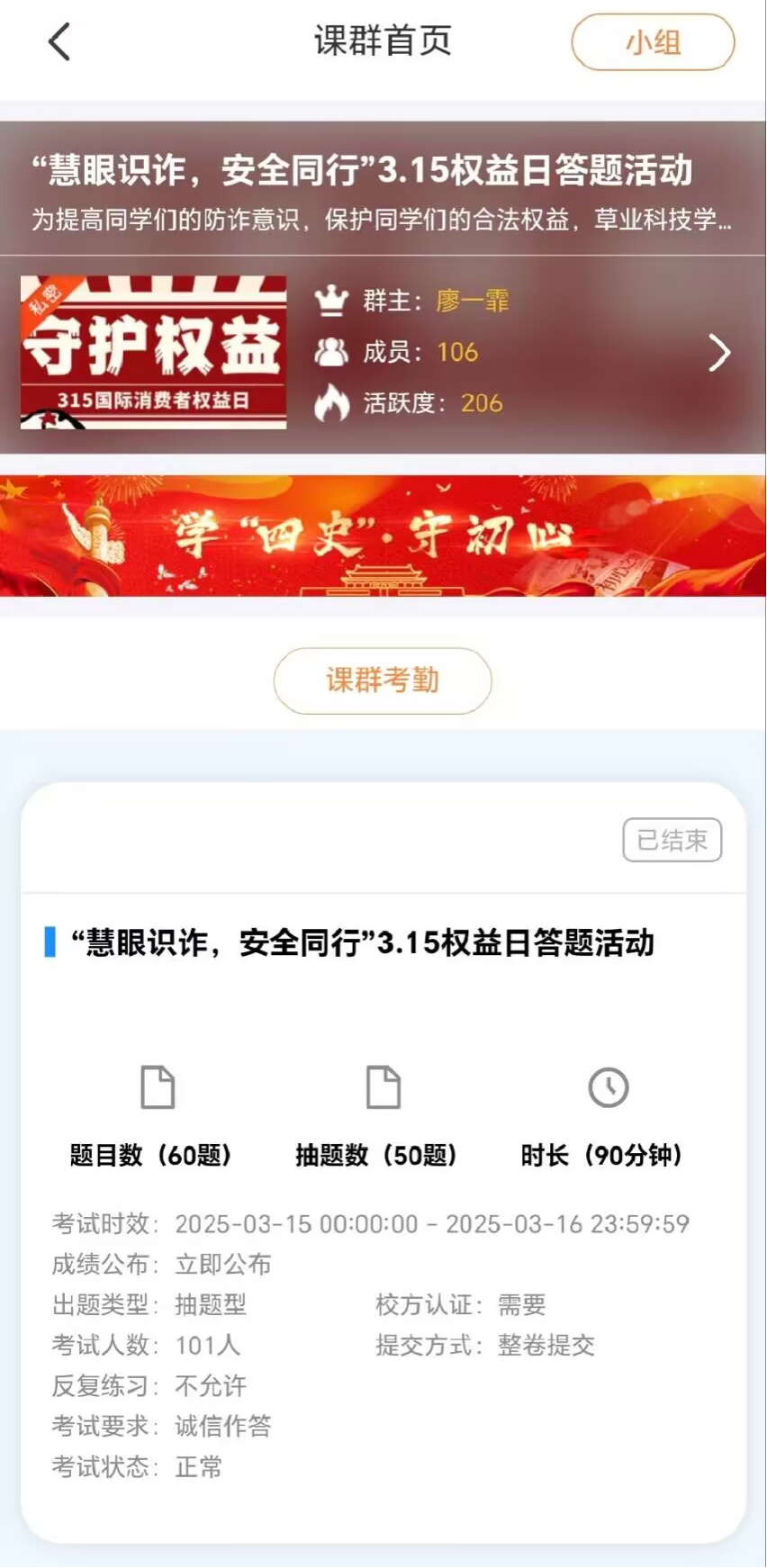 组织开展了“慧眼识诈 安全同行”主题权益活动。本次活动通过线上知识答题的形式,面向全院同学开展防范电信诈骗知识普及,累计吸引百余人参与,在校园内掀起了学习反诈知识的热潮。