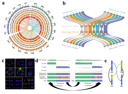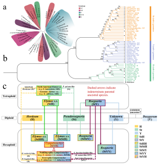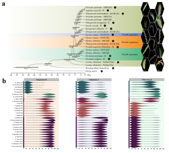 高原生态牧草的基因身份证。研究团队成功组装出垂穗披碱草的染色体级别基因组图谱——这是禾本科小麦族中继面包小麦之后第2个异源六倍体高质量基因组。研究发现披碱草属的核心亚基因组之一即Y亚基因组来源于簇毛麦属(Dasypyrum)的V基因组,且垂穗披碱草极可能是由紫大麦草(Hordeum roshevitzii,HH基因组)和垂穗鹅观草(Roegneria nutans,StStYY基因组)分别作为父母本祖先种杂交进化而来,并这一发现如同找到了此类牧草的"族谱",为解析其适应高原极端环境的能力奠定了基础。