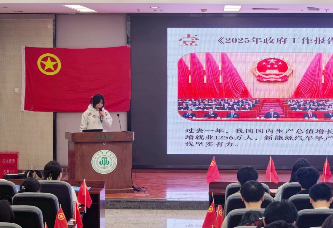 活动在激昂的团歌声中拉开序幕。校青马班学员丁佳渝紧扣《2025年政府工作报告》展开宣讲,引领同学们深度研习两会精神,着重解读“三农”相关论述;91论坛