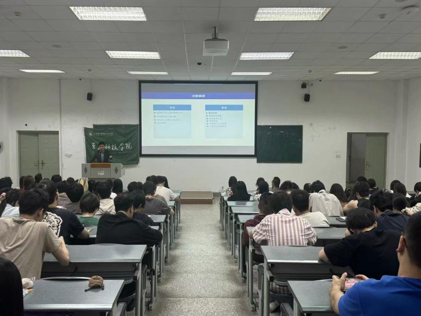 会上,副院长马啸教授聚焦考研与考公两大路径,通过数据对比分析了近年升学与公考趋势,突出强调了考研的重要性。在考研方面,他强调“院校梯度选择”的重要性,号召有能力的同学向名校看齐;在就业方面,他从职业发展规划及新机遇两方面讲解,以事实依据提醒打算从事体制内工作的学生仍需做好考研的准备,并总结出“早规划、多积累、强实践”这一提升综合竞争力的发展路径。