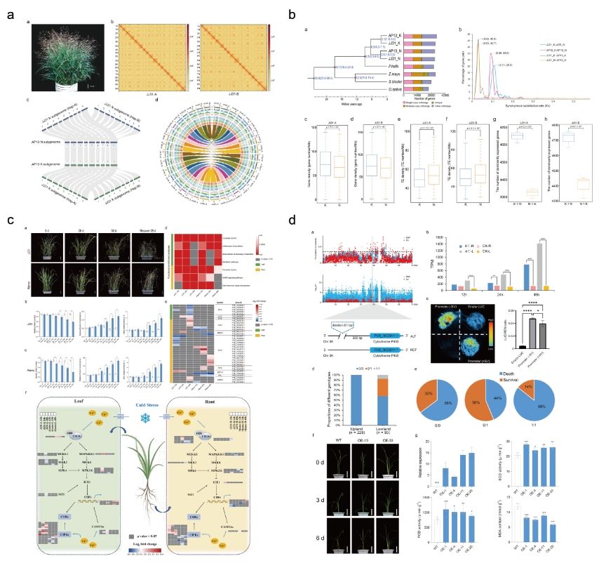 图1 a.高地型柳枝稷单倍型基因组组装b.比较基因组学和优势亚基因组分析c.两种生态型冷胁迫响应差异d.CYP450基因挖掘及功能验证