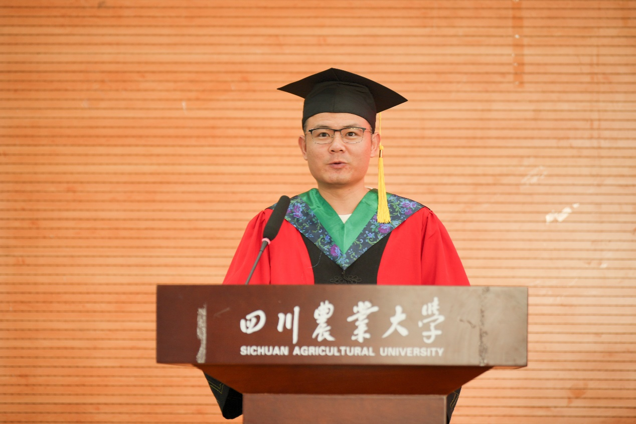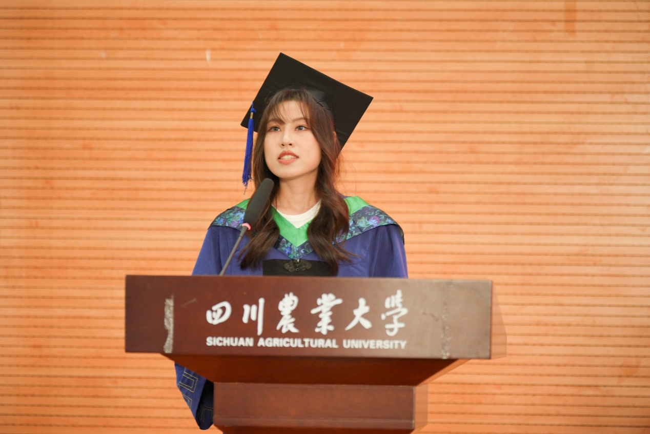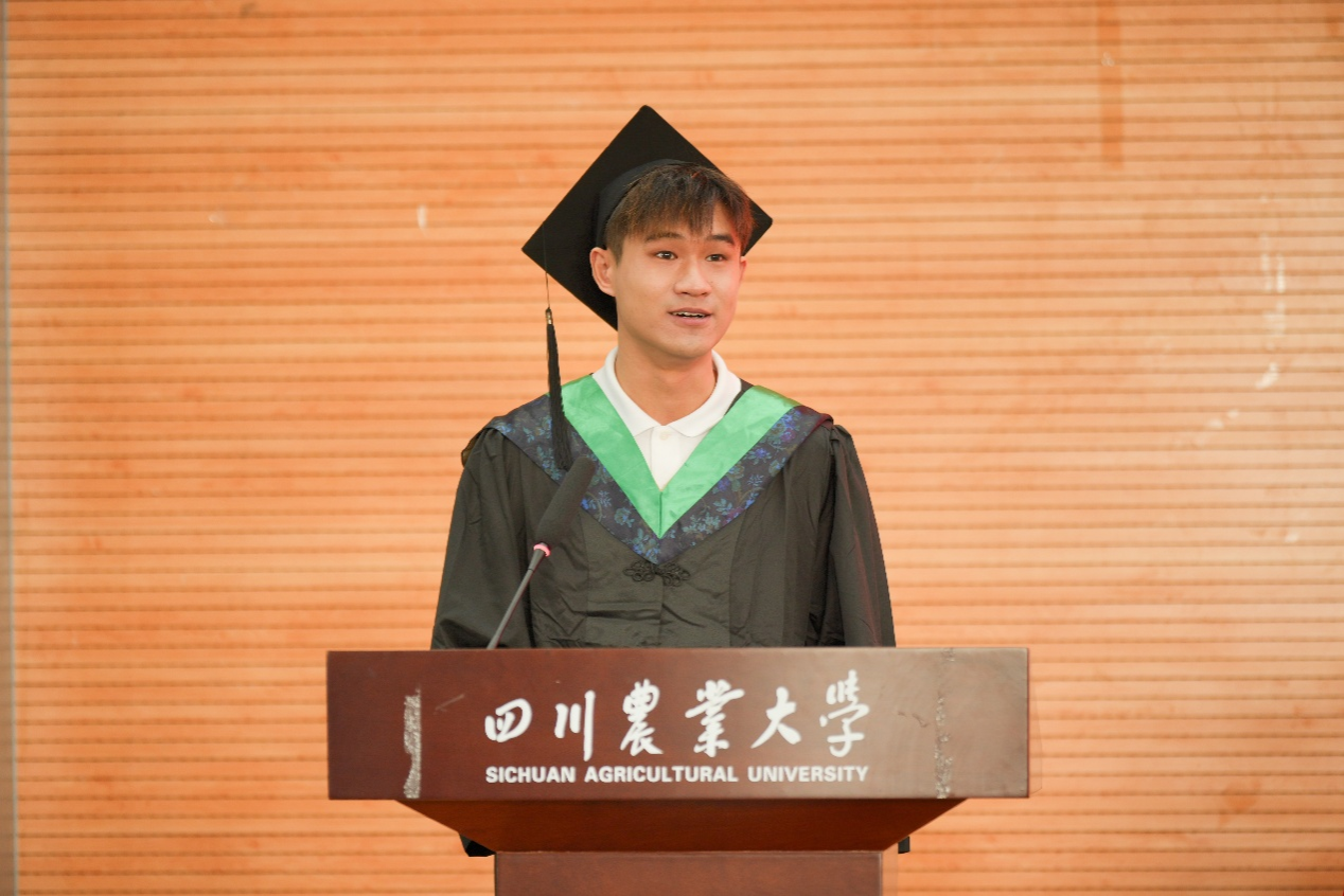 草学202102班熊春森代表本科毕业生发言。他回忆起四年前初探校园时觉得川农“真小”,而如今“好大”的川农承载了同学们无数青春故事的回响。接下来,他将心怀“追求真理”的赤诚,肩扛“造福社会”的担当,秉持“自强不息”的韧劲,前往中国农业大学继续乘风破浪。