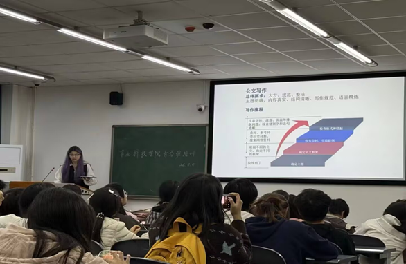 随后,团委组织部部长曾雨同学聚焦常用公文写作,详细讲解了活动通知、请假条等日常文体的基本格式与语言规范。通过范例分析,她强调了内容准确、语言得体、格式统一在实际应用中的重要性,助力同学们提升办公文书处理的规范性与效率。