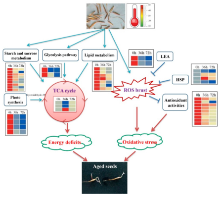 Seed aging has an important effect on the germplasm preservation and industrialized production of Siberian wildrye (Elymus sibiricus) in the Qinghai-Tibet Plateau. However, so far its underlying molecular mechanisms still largely remain unknown. To shed light on this topic, one-year stored seeds of E. sibiricus were exposed to artificial aging treatments (AAT), followed by seed vigor characteristics and physiological status monitoring. Then global proteomics analysis was undertaken by the tandem mass tags (TMT) technique, and the proteins were quantified with liquid chromatography-tandem mass spectrometry on three aging time points (0 h, 36 h and 72 h). Finally, we verified the expression of related proteins by parallel reaction monitoring (PRM). Our results demonstrated that the seed vigor decreased remarkably in response to artificial aging, but the relative ion-leakage and malondialdehyde content, superoxide anion and hydrogen peroxide showed the opposite situation. Proteomic results showed that a total of 4169 proteins were identified and quantified. Gene Ontology (GO) analysis and Kyoto Encyclopedia of Genes and Genomes (KEGG) analysis indicated that a series of key pathways including carbohydrate metabolism, lipid metabolism, and antioxidant activity were severely damaged by aging treatments. Numerous key proteins such as glyceraldehyde triphosphate glyceraldehyde dehydrogenase, succinate dehydrogenase, lipoxygenase, peroxidase, glutathione-s-transferase and late embryogenesis abundant proteins were significantly down-regulated. However, the up-regulation of the heat shock protein family has made a positive contribution to oxidative stress resistance in seeds. This study provides a useful catalog of the E. sibiricus proteomes with insights into the future genetic improvement of seed storability.