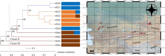 Russian wildrye,Psathyrostachys junceus(Fisch.) Nevski, is an important wild steppe perennial grass, which is characterized by longevity and short robust rhizomes. It also has highly resistance in grazing and abiotic stress. In this study, the genetic diversity of eleven P. juncea wild germplasms from north and central Asia was investigated using AFLP markers. The P. juncea populations were divided into three clades in both UPGMA dendrogram and PCoAclustering corresponding to the three genetic memberships in STRUCTURE analysis. The genetic specificity of Xinjiang (XJ) populations was revealed by the highest N e (1.5411) and H j (0.3553) and their dispersion shown in UPGMA. High inbreeding coefficient (Wright's F statistics, f = 0.496, F st = 0.128) was observed although a moderate degree of gene flow (N m = 1.4736) existed, that may ascribe to habitat fragmentation or the low seedling recruitment, which ultimately resulted in decrease of population size and their genetic diversity. The key factors inducing moderate genetic differentiation detected in this study were isolation by distance (IBD), climatic variabilities and geographical barriers. All these results provide insights into the study of genetic status and germplasm collecting of Russian wildrye.