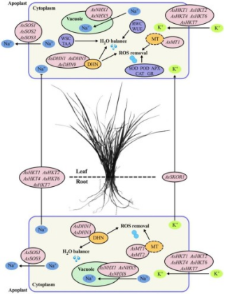 As a pivotal plant growth regulator, spermine (Spm) participates in the regulation of salt tolerance in plants. Creeping bentgrass was pretreated with or without Spm (100μM) and then subjected to a prolonged period of salt stress (24 days). Results showed that the Spm-pretreated plants maintained significantly higher root vitality, leaf relative water content, photosynthesis, water use efficiency, osmolytes accumulation, and antioxidant enzyme activities as well as lower osmotic potential and oxidative damage in leaves under salt stress. The application of Spm significantly decreased Na+accumulation in root and leaf and K+loss in roots, resulting in higher K+/Na+ratio in leaf and root; the Spm enhanced the SOS pathway and also up-regulated HKTs and AsSKOR1 associated with the homeostasis of Na+and K+in leaves and roots; the expression ofAsNHX1,AsNHX5, andAsNHX6was enhanced by the Spm contributing to better capacity of Na+compartmentalization in cells. The application of Spm also further increased the AsHAL2 expression in leaves under salt stress associated with the enhancement of sulfur transfer and assimilate. In addition, the upregulation of metallothionein genes (AsMT1andAsMT2) and dehydrin genes (AsDHN1,AsDHN3, andAsDHN9) and the accumulation of DHN (56 KDa) induced by the Spm could be an important regulatory mechanism of salt tolerance in creeping bentgrass. Current findings reveal the important role of Spm in regulating water and oxidative homeostasis, Na+/K+transport, and stress-defensive proteins accumulation for the improvement of salt tolerance in plants.