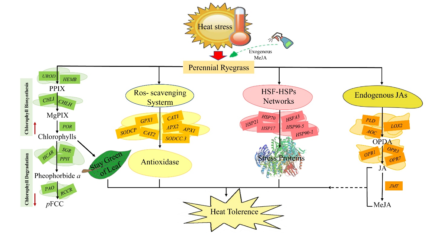 Methyl jasmonate (MeJA) plays a role in improving plant stress tolerance. The molecular mechanisms associated with heat tolerance mediated by MeJA are not fully understood in perennial grass species. The study was designed to explore transcriptomic mechanisms underlying heat tolerance by exogenous MeJA in perennial ryegrass (Lolium perenneL.) using RNA-seq. Transcriptomic profling was performed on plants under normal temperature (CK), high temperature for 12h (H), MeJA pretreatment (T), MeJA pretreatment + H (T-H), respectively. The analysis of diferentially expressed genes (DEGs) showed that H resulted in the most DEGs and T had the least, compared with CK. Among them, the DEGs related to the response to oxygen-containing compound was higher in CKvsH, while many genes related to photosynthetic system were down-regulated. The DEGs related to plastid components was higher in CKvsT. GO and KEGG analysis showed that exogenous application of MeJA enriched photosynthesis related pathways under heat stress. Exogenous MeJA signifcantly increased the expression of genes involved in chlorophyll (Chl) biosynthesis and antioxidant metabolism, and decreased the expression of Chl degradation genes, as well as the expression of heat shock transcription factor - heat shock protein (HSF-HSP) network under heat stress. The results indicated that exogenous application of MeJA improved the heat tolerance of perennial ryegrass by mediating expression of genes in diferent pathways, such as Chl biosynthesis and degradation, antioxidant enzyme system, HSF-HSP network and JAs biosynthesis.