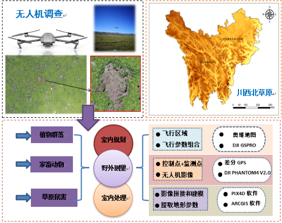 为解决高寒草地植物、动物资源传统地面调查效率低、精度差、成本高的问题,本研究采用“无人机+地面调查”的“空—地”结合调查监测模式,主要开展植物群落植被盖度、生物量、家畜种群数量、啮齿动物分布及秃斑地面积比例调查与监测,为草地管理和鼠害防控提供方法和技术。