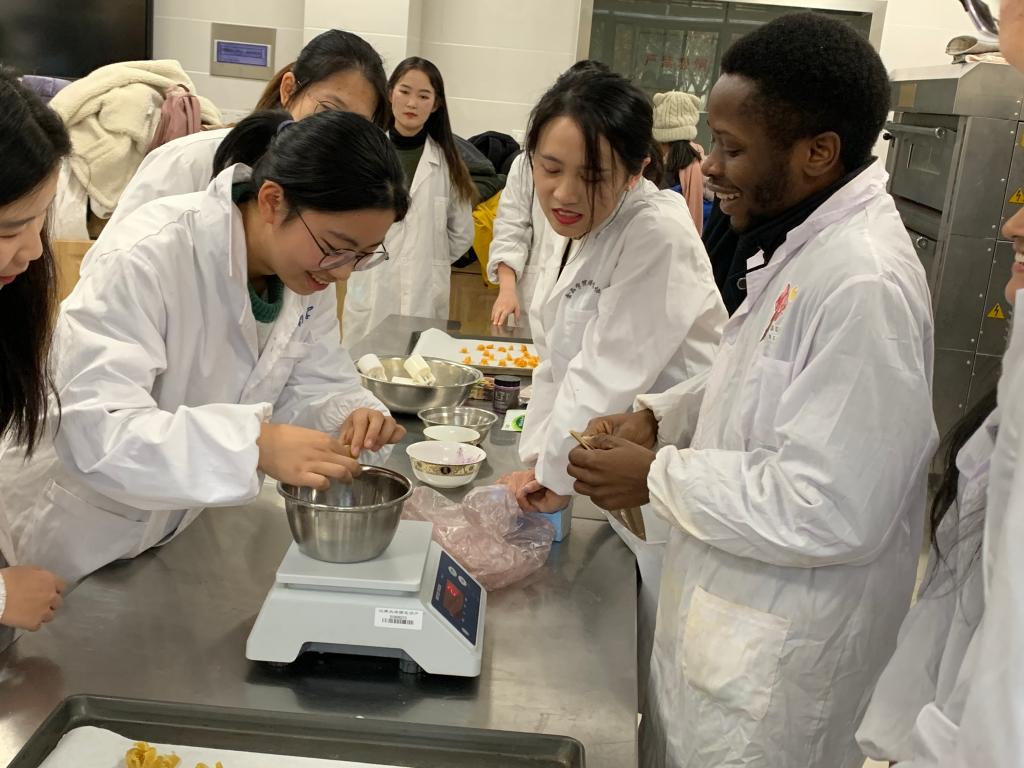 随后,进入烘焙环节,现场同学分为两组,在烘焙俱乐部成员指导下进行面点制作和烘焙,一组制作戚风蛋糕,一组制作桃山皮月饼,中西点心碰撞,趣味性十足。在制作过程中,中国学生热情、耐心地讲解制作细节,留学生们认真学习,展示出了独特的烘焙天赋。在欢声笑语中,桃山皮月饼和戚风蛋糕前期准备完成,进入了烘烤阶段。