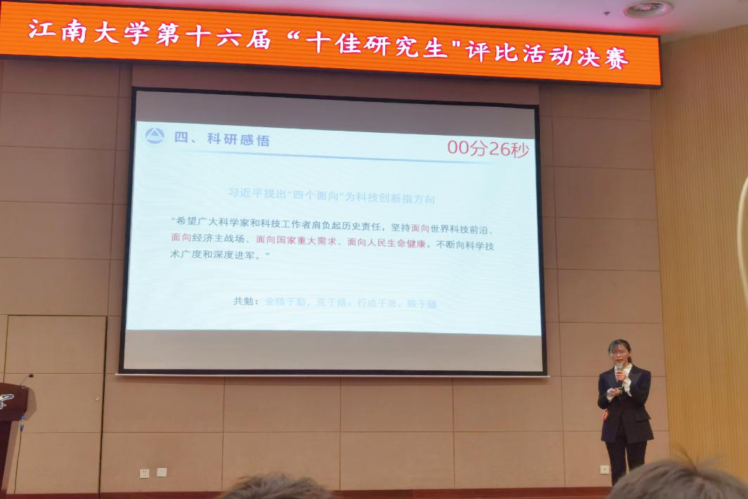 研究生李月一路过关斩将,顺利成为“十佳研究生”候选人,入围决赛(全校共15名)。在决赛环节,各位优秀研究生依次进行个人展示、专题问答和观众投票,经过激烈角逐,李月以第3名的优异成绩荣获91论坛