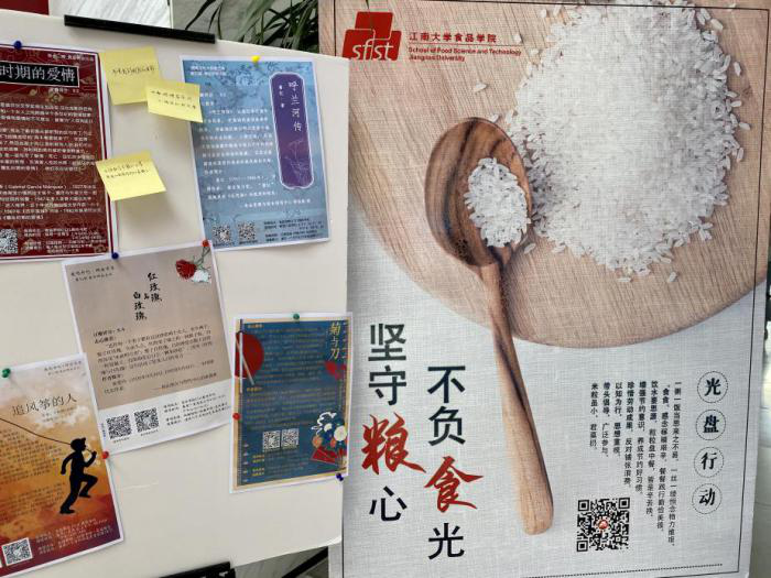此外,食品研会还发出“坚守粮心,不负食光”的倡议。在节约粮食展板前,同学们热烈讨论今年的疫情和洪涝灾害对我国粮食产量的影响,大家表示会将节约粮食理念谨记心中,以知为行。