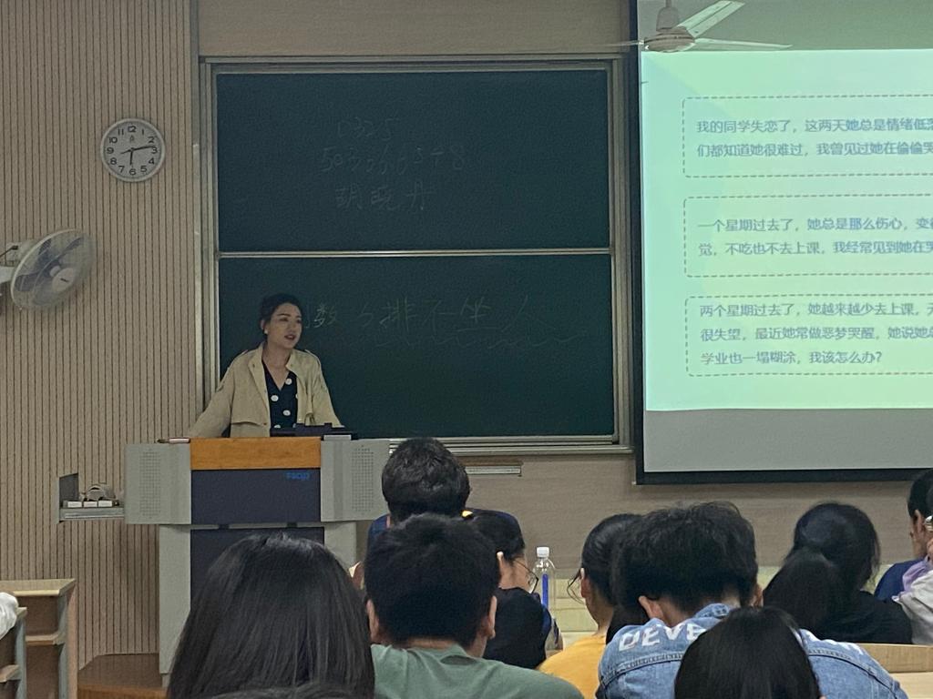 胡晓丹老师首先阐述了举办此次培训的意义,表达了学校和学院对同学们身心健康状况的关注与重视。接着,胡晓丹老师就日常宿舍生活中可能出现的一些问题情境,与宿舍长进行现场交流互动,引导同学们思考宿舍长的职责和解决问题的方式方法。胡晓丹老师通过举例,提示了宿舍长们在学习和生活中需要重点关注的人群,并就同学可能存在的表现为宿舍长提供可采取的措施建议。她希望宿舍长们高度重视心理危机问题,明晰能力与责任的边界,发现端倪及时向老师求助。