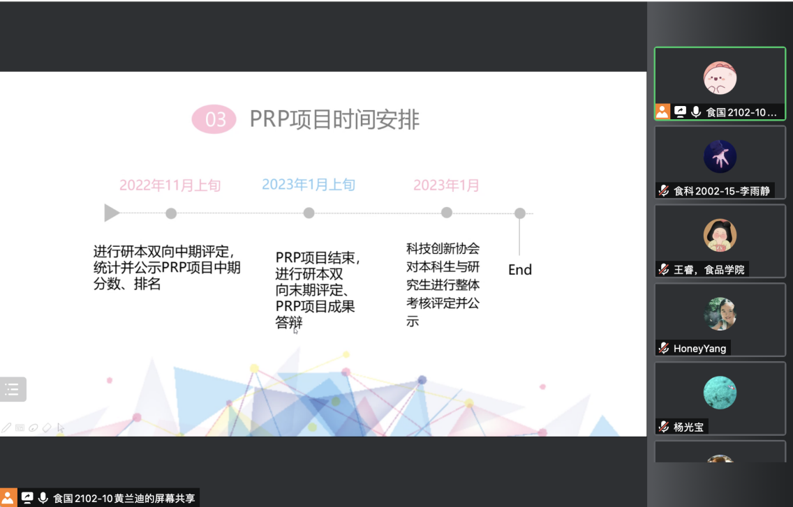 最后,往届参与PRP同学分享经验。2020级研究生杨晗婕有着本科和研究生的两次PRP项目经历,她将PRP项目概括为一次体验和一次预习。通过PRP项目可以尝试感兴趣的研究方向,为科研之路作准备,提前适应实验室环境。