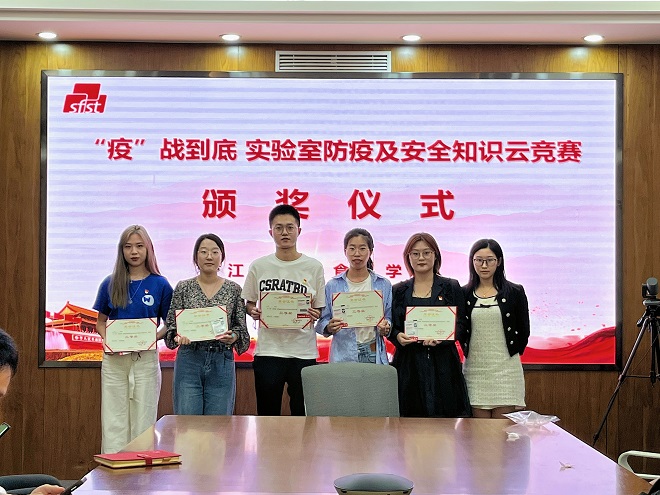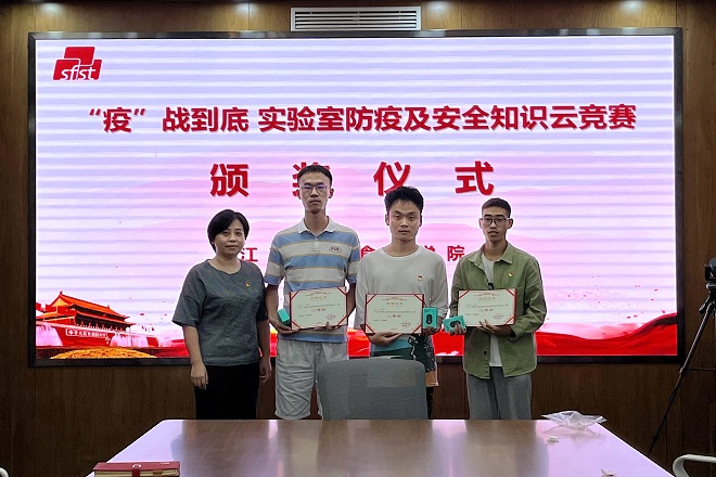 主办的“疫”战到底—实验室防疫及安全知识云竞赛活动圆满结束。活动共评选出一等奖1名,二等奖3名,三等奖5名和优秀奖5名。颁奖仪式上,学院实验室主任王文龙、党委专职组织员王胤、研究生辅导员胡卉君、谷物与淀粉工程研究中心博士党支部书记尤钰娴分别为获奖学生颁发证书及奖品,并再次强调了疫情常态化防控形势下,实验室安全教育的重要意义。