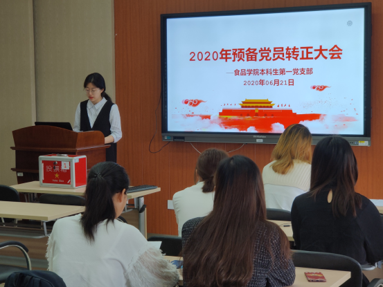 全体党员首先奏唱国歌,随后开展预备党员转正工作,宣传委员杨光宝同志代表支委会宣读了拟转正的预备党员名单,随后拟转正的预备党员依次陈述转正申请,入党介绍人汇报综合考察意见,在正式党员进行无记名投票表决后,支部书记胡晓丹同志代表支委会宣读表决结果并宣读大会决议。
