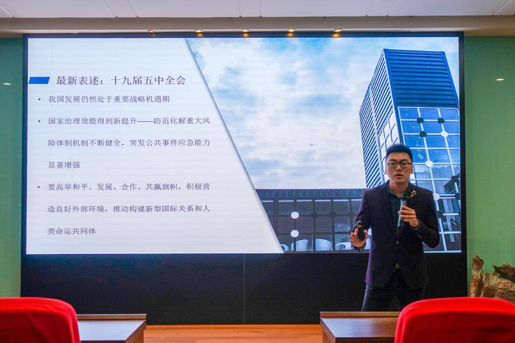 孙晨光带领大家回顾了十九大以来历次全会研究的主题,进一步阐述了五中全会上提出的六大发展要求、五大遵循原则,介绍了“十四五”规划的编制进程,说明了“十四五”规划对实现中国2035年远景目标具有的伟大意义。他从国家的综合国力出发,谈论了中国当前新局面的发展、人民对生活的满意度、过去五年在党的领导下取得的光辉成就,增强了同学们在党领导下的的幸福感与认同感。他从百年历史背景、历史发展、国际视野这三个方面阐述了中国对全世界发展的贡献,希望同学们能学习贯彻党的十九届五中全会精神,成为“中国故事”的执笔者、参与者。