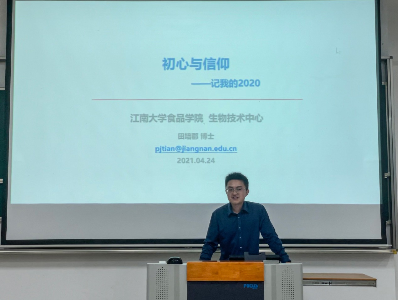 与爱尔兰科克大学联合培养博士,疫情期间身在国外,积极向国外朋友介绍中国防疫的有效举措,帮助他们理解中国,正确评价中国。同时,还组织动员江大益生菌团队向其所在的爱尔兰John Cryan教授团队捐赠1000只防疫口罩,传递中国温度,体现了青年党员的初心与信仰、情怀与担当。田培郡围绕“中国战‘疫’”、“四个自信”、“人类命运共同体”、“共产主义接班人”、“中国梦”五个关键词以其国外亲身经历讲述了身为共产党人对初心与信仰的理解:抗疫大考中彰显的中国速度、中国精神与中国力量震惊世界,体现了在中国共产党领导下我国集中力量办大事的制度优势。中国战“疫”取得成功更加坚定了对“四个自信”的理解和把握。在疫情大考面前,中国和受疫情影响的世界各国风雨同舟、命运与共,为全球疫情防控贡献重要力量,生动诠释了为世界谋大同、推动构建人类命运共同体的大国担当。作为共产主义接班人的青年一代,当以报效国家为己任,以服务人民为荣光,接好历史的接力棒,为实现中华民族伟大复兴中国梦而努力奋斗。