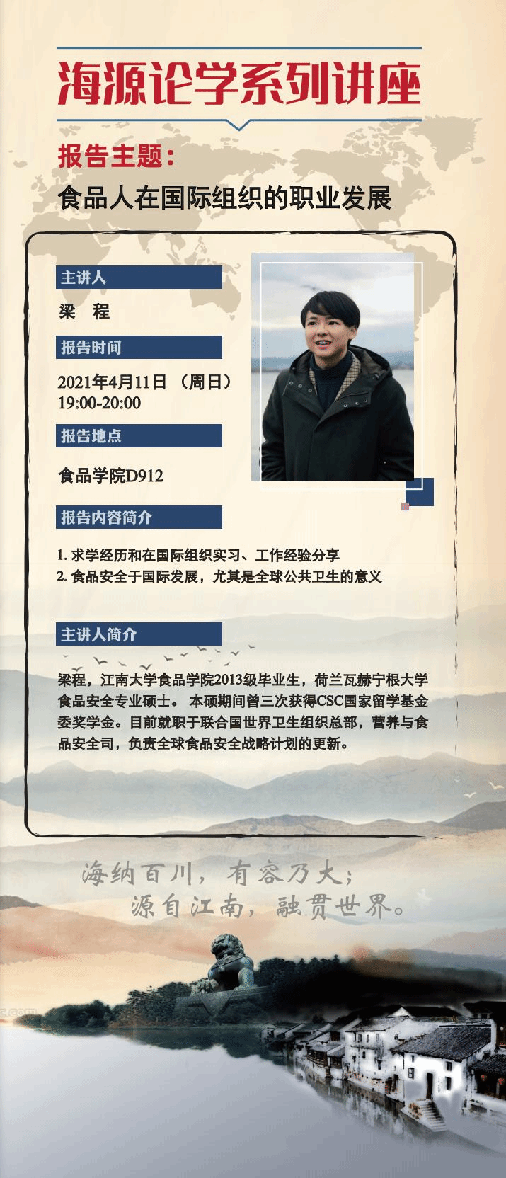 D912隆重举行并取得圆满成功。本次讲座嘉宾邀请了优秀校友梁程作题为“食品人在国际组织的职业发展”的线上报告,91论坛