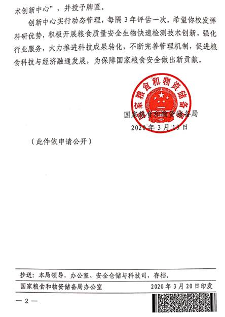 建设“国家粮食质量安全生物快速检测技术创新中心”,并授予牌匾。
