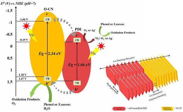 图2. PDI/O-CN异质结光催化剂的界面电荷转移过程和π-π相互作用示意图