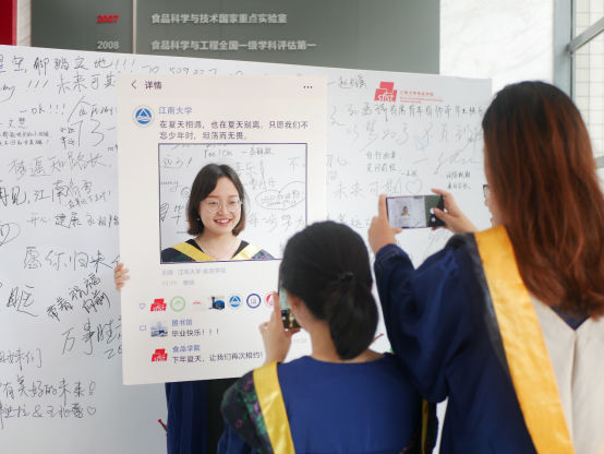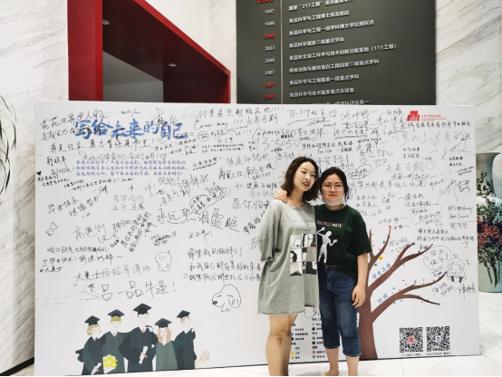 “写给未来的自己”主题喷绘留言板广受毕业生同学们欢迎。留言板右下角设计有时光树,将美好的校园回忆寄托于小圆点上,粘贴到树枝上,互动性十足。毕业生们纷纷在留言板上抒发自己的毕业感想,或写下对未来的期许、对人生的美好祝愿,或绘画各式卡通形象活跃气氛,或写下铭记于心的“笃学尚行,止于至善”校训,并在留言板前合影留念。