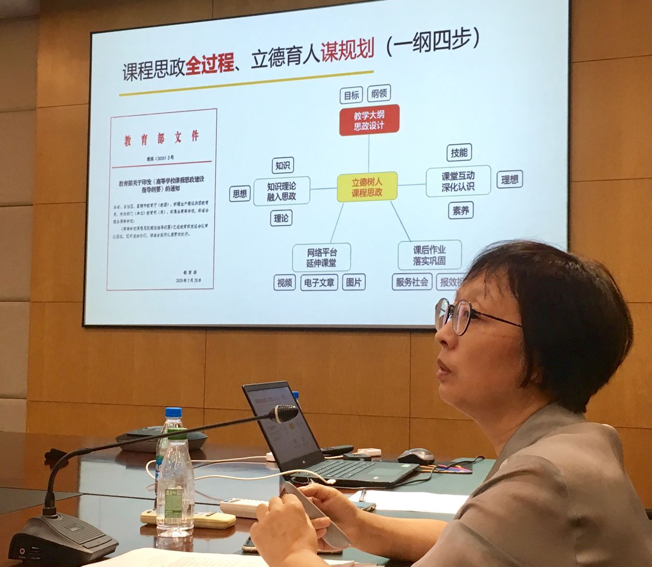在专题报告环节,张云霞教授做了“课程思政建设思考--学习《高等学校课程思政建设指导纲要》”的主题报告。她从《纲要》的背景、意义和具体要求方面进行了解读,并从课程思政建设的目标及内容谈起,通过分享其他高校效果较好的课程思政案例,和与会老师一起探讨了如何结合我院学科和专业特点分类推进课程思政建设,建议围绕国家、区域和行业发展的需求来构筑思课程思政建设,充分发挥思政教育功能。