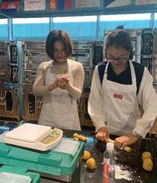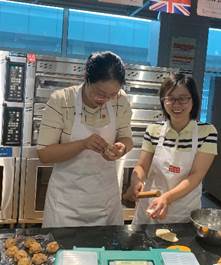 分工会特地邀请了中粮金焙工匠复兴烘焙职业学校的烘焙师傅前来教学。此次制作的月饼种类为苏式鲜肉月饼和广式莲蓉蛋黄月饼,教学先从鲜肉月饼的和面皮开始,烘焙师傅先进行讲解,老师们围绕四周认真学习。随后,各位老师跃跃欲试,亲身实践,师傅一对一进行指导。月饼制作完成后,送入烤箱。经过一两个小时的实践,老师们都基本掌握了苏式月饼和广式月饼的的制作技艺。