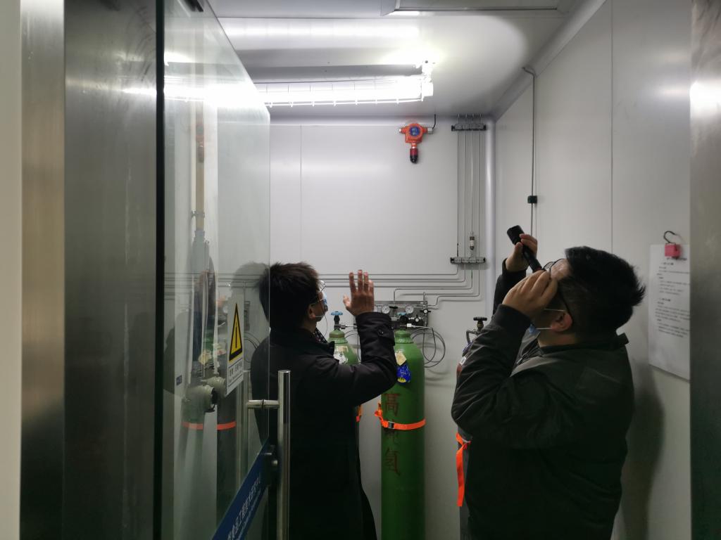 检查组现场检查气体泄露报警装置