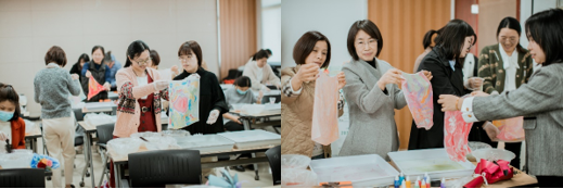 分工会特地邀请了丝巾制作工作室的老师前来教学。活动伊始,老师先分享了丝巾的穿戴方式以及春日搭配,小小丝巾,四方之间,再平淡的穿搭装束,也会因为它的加入,脱颖而出,不流于俗。分享结束后,老师便按照“选色—拓染—固色—清洗—吹干”的步骤进行教学,随后参加活动的老师们纷纷动手,挑选好自己喜欢的颜色后按照步骤制作属于自己的丝巾。