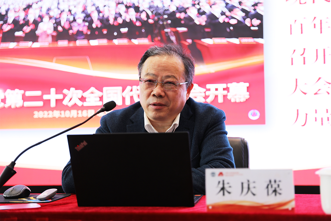 朱庆葆指出,党的二十大是在全党全国各族人民迈上全面建设社会主义现代化国家新征程、向第二个百年奋斗目标进军的关键时刻召开的一次十分重要的大会,是一次高举旗帜、凝聚力量、团结奋进的大会。他围绕党的二十大报告确定的重要思想、重要观点、重大战略、重大举措,从深刻把握党的二十大的主题和主要成果、深刻把握新时代十年的伟大变革、深刻把握新时代新征程面临的机遇和挑战、深刻把握开辟马克思主义中国化时代化新境界的历史责任、深刻把握以中国式现代化全面推进中华民族伟大复兴的使命任务、深刻把握全面从严治党的重大要求、深刻把握青年师生的责任使命等七个方面对党的二十大精神作了准确阐释和深入解读。