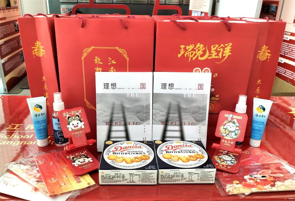学校为留校过年的同学们提供了暖心健康包、春节红包和年午饭餐券。学院则精心准备了护手霜、消毒液、新春口罩,愿同学们动若脱兔、岁岁安康;送上手机架、曲奇饼,助同学们瑞兔纳福、共欢同乐;还有一本经典书籍《理想国》,愿同学们带着知识、真理与善良、勇敢,追寻自己的彼岸,前兔似锦,大展宏兔!