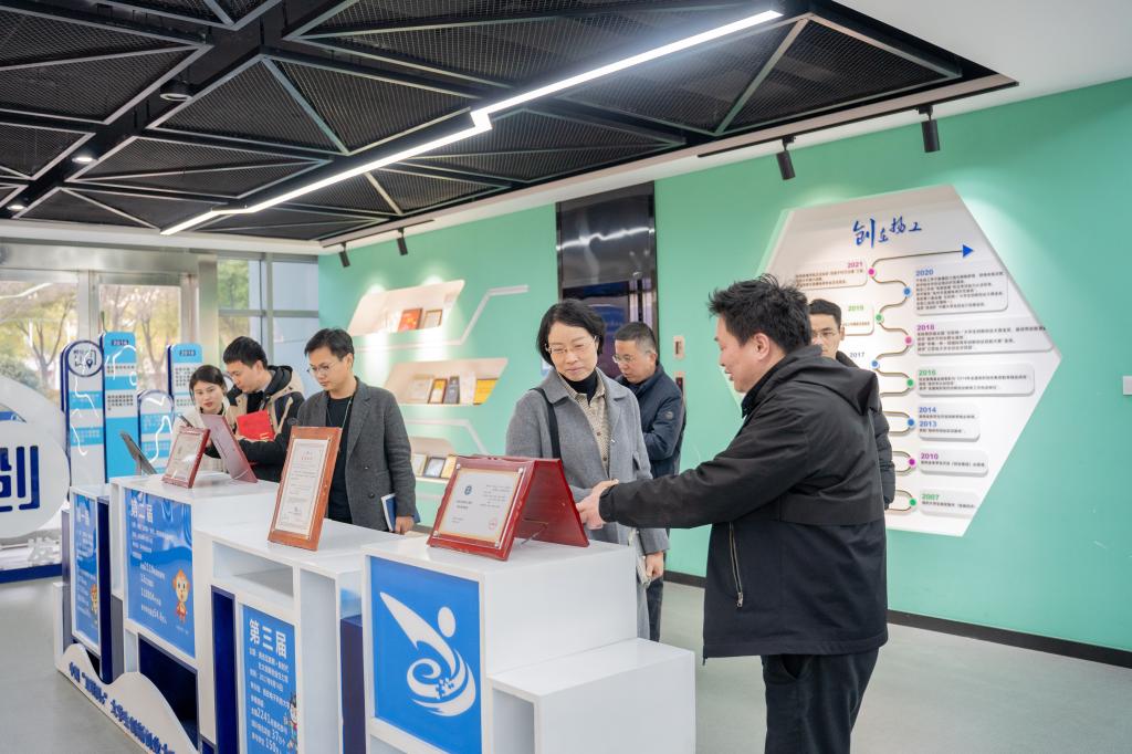 随后,调研组一行前往扬州工业职业技术学院创新创业学院进行交流。副校长傅伟、创新创业学院院长颜正英、电商学院党总支书记王盛、副院长王新与调研组开展座谈。傅伟向调研团分享了国家级创新创业教育实践基地建设经验和创新创业学院的办学思路。双方围绕创新创业人才培养规律、支撑条件、发展机遇等进行了深入的探讨。颜正英带领调研组先后参观了大学生创业园、电商直播学院。