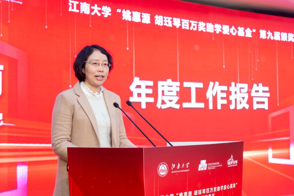 傅莉莉向大会作2022年爱心基金工作报告。她从基金的设立背景、发展历程、运行机制、奖助种类及人数金额等方面对过去一个时期的工作予以回顾和总结。她指出,“姚惠源∙胡珏琴百万奖助学爱心基金”理事会不断探索高等教育发展基金的创新育人模式,用爱与实践传递着老中青食品人共同的强国梦想,这不仅是一种物质帮扶和精神鼓励,更是对学院改革发展的真诚关心与鼎力支持。
