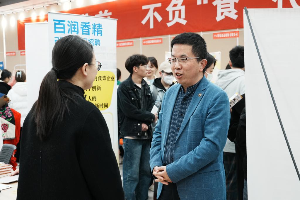 还专门策划举行“院企面对面”活动。学院领导、相关工作人员与来自河南双汇、浙江五芳斋、好丽友食品、江苏逅厨等17家招聘企业的人力资源总监、研发技术专员深入座谈交流,内容涉及校院发展、招聘创新、研发合作、协同育人等。李雷表示,希望加强“走出去”,带领学生多去企业参访、实习、历练、沉淀,同时加强“引进来”,邀请企业与校院一起打造更贴近市场、更富有特色的大学生职业生涯规划与指导体系。在场企业代表纷纷表示赞同,并愿意和高校一起打造全方面、谋长远的合作模式。