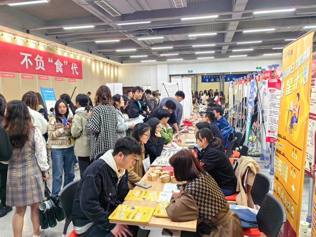 招聘会现场,各家企业通过海报、展板、手册、视频、产品实物等多种形式进行宣传,竞相抛出橄榄枝。前来应聘的同学们在用人单位展位前详细咨询、投递简历,进行深入沟通和交流,了解企业发展方向、岗位需求、薪资水平等信息。一些企业还进行现场面试,与学生达成初步意向。有用人单位HR表示,“我们特别喜欢江大食品的毕业生,也愿意投入成本培养他们。”