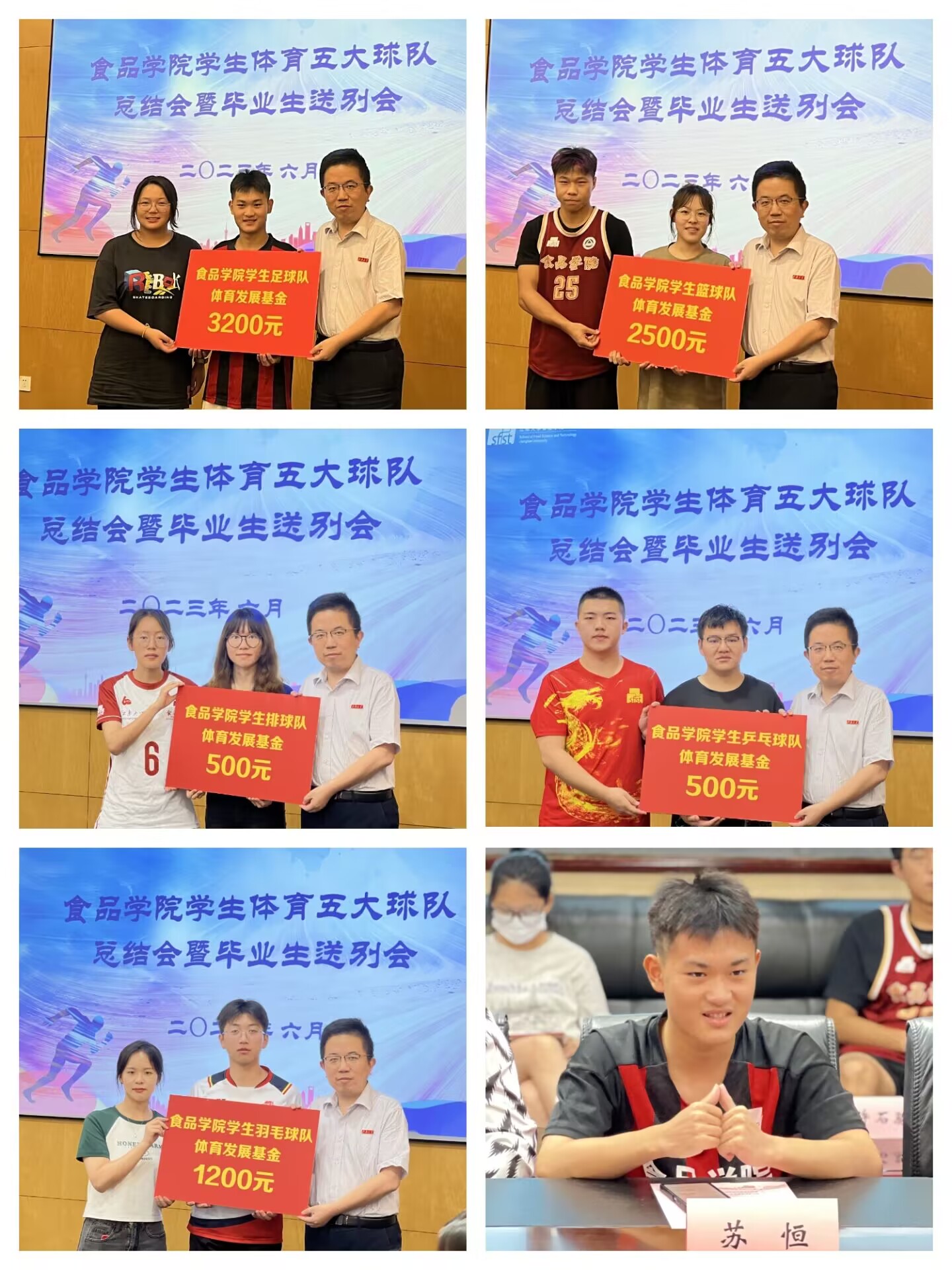 在满满的自豪与热烈的掌声中,李雷为五大球队依次颁发体育发展专项基金并合影留念。李琳为毕业生球员颁发纪念证书。